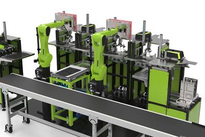 ENGEL为自动化大批量生产提供的系统解决方案包括一台duo 1700注塑机,三个用于准备大量金属嵌件和处理有机板材的easy - ix铰接机器人,一个viper 90线性机器人和一个ENGEL IR烘箱。ENGEL从单一来源提供制造单元作为系统解决方案。这两个半壳是在同一个模具中一次性生产出来的。为此,两个有机薄片在红外烘箱中同时加热,插入模具,成型,然后立即在注塑过程中直接功能化。