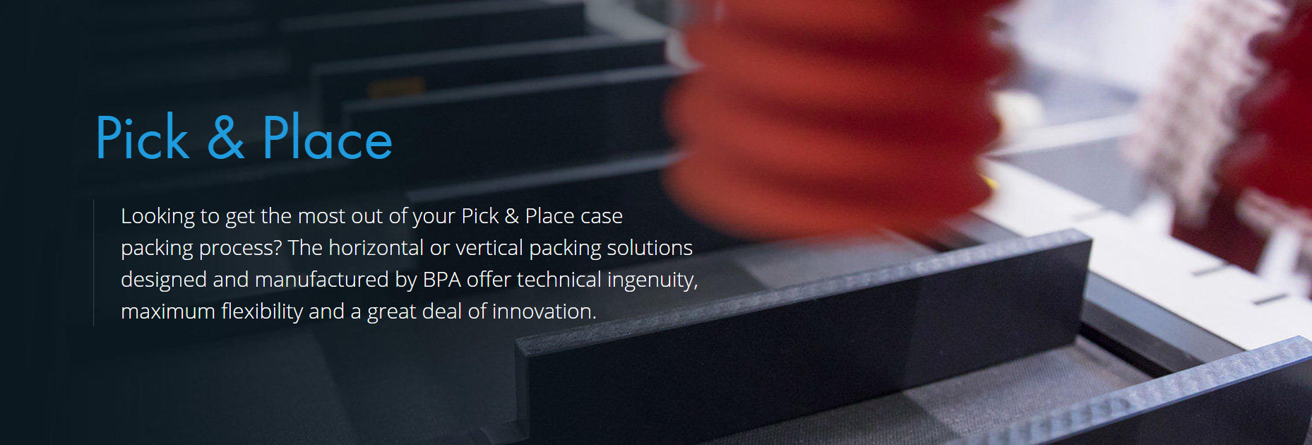 PickPlace系统主要用于产品处理单个产品放入托盘、箱箱或其他二级容器并提供案例打包BPA创建的创新系统优于传统解决方案整合各种机器人 状态控件软件 硬件推信封创新 提供最大回报PickPlace案例打包法哪个系统最适合您的生产环境