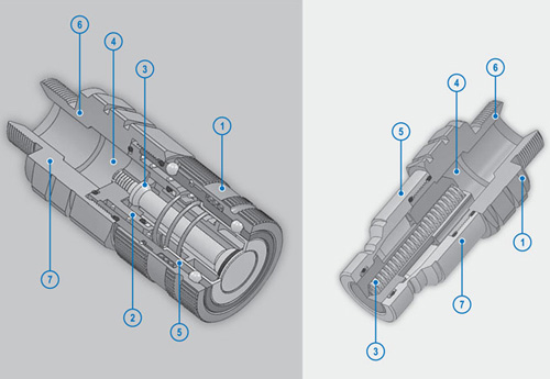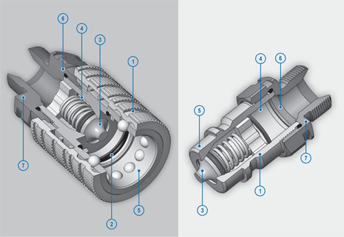 • 快速释放联动有各种大小(从1/4转至1),套接合和乳头部分可互换性,依据是ISO 7241-A、ISO 14541、ISO 16028(“Flatface”)