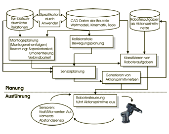 Planning of such processes is carried out in virtual environment, hence displacements between real world and virtual world may occur. Theses displacements are treated by skill primitive nets successfully. Therewith a system for planning, evaluation, and execution of assembly tasks is provided.