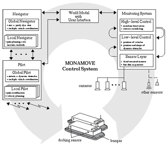 The flexible and automated flow of materials, e.g. between different work cells and a computer controlled warehouse, becomes more and more important in modern factory environments. To obtain such a flexibility it is obvious to use autonomous guided vehicles (AGV). Many of the autonomous guided vehicle concepts, which are known from literature, use highly specialized on-board sensor systems to navigate in the environment. In contrast to these concepts, the flexible transport system MONAMOVE proposed by us uses only simple, low-cost on-carrier sensors in combination with a global monitoring system and a global navigation system. This combination of global monitoring and global navigation enables the carriers to navigate without any fixed predefined paths.