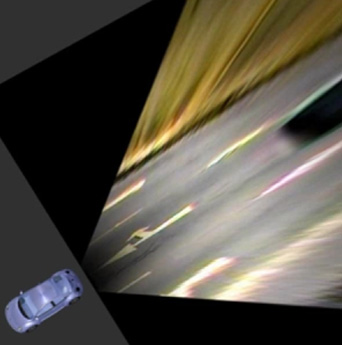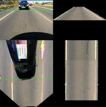 In many of our approaches for vehicle detection we use a top-down-view that is generated by projecting the camera pixels via Inverse Perspective Mapping (IPM) onto the street as can be seen in the image below and in the corresponding video. In this view we are looking down onto the street plane at right angle. Thus, no perspective mapping has to be considered for the distance calculation of two arbitrary points of the street plane, which simplifies processing of many algorithms.