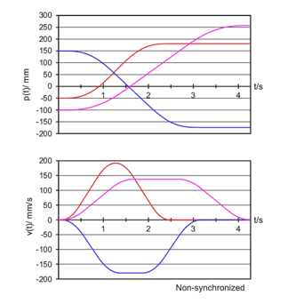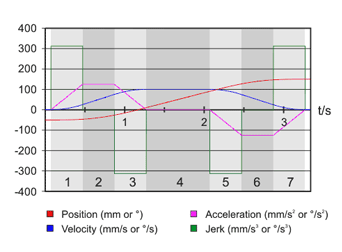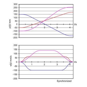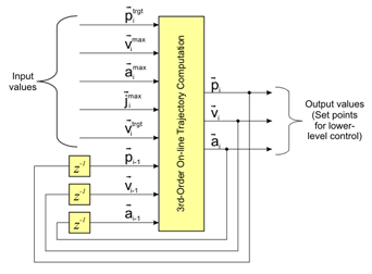 Decision trees are used as basis for the approach to realize on-line trajectory generation for N-dimensional space with arbitrary input values (Fig. 1) and synchronization between all degrees of fredom as shown in Fig. 2. The figure illustrates a simple case for third-order on-line trajectory generation with and without synchronization for three degrees of fredom. In correspondence to Fig. 1 a function, which maps the 8N-dimensional space onto 3N-dimensional space must be specified (with N = 6 for Cartesian space). Defining this function is the major part of this reasearch work. Once defined it would result in the classical trajectory progression with rectangular jerks as shown in Fig. 3, which depicts the most trivial case of a third-order trajectory.
