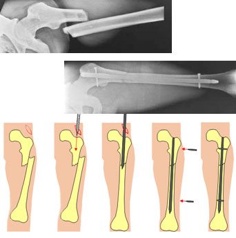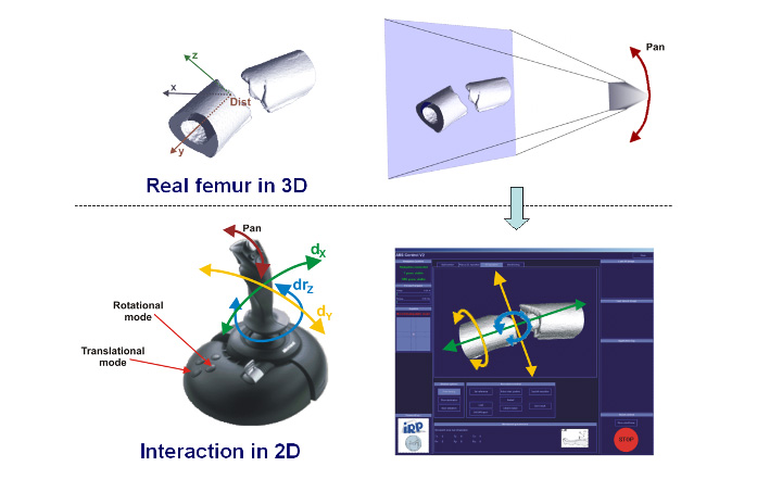 The presented form of visualization and interaction with a telemanipulator system for fracture reduction in the femur turned out to be efficient and intuitive. All test persons have been able to perform reliable reductions with high reduction accuracies after only a short time of learning. These results clearly show the potential of robotized fracture reduction, which will ensure high quality outcomes of such operations in the future.