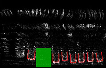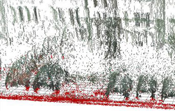 An example for such a scatter diagram can be seen below (image: 3D Scatter diagram). Every point in this diagram represents a real 3D point. Points at the street level are colored red, obstacles (= points above the street level) are displayed in black. If every 3D point is projected on its corresponding point in the ground plane, a top down view is created which shows the whole scene as seen from above. Now patterns become visible which can clearly be identified. Cars, for example, build a pattern shaped like the letter "U". If some of these can be found in the top down view, the positions of cars are clearly recognized. Free parking spots are now detected by searching for free space between these cars. For an illustration of the process, see the following image. Recognized cars are highlighted in red, free space is marked green (image: Topdown view of the scene). If a parking space is found, the automated parking process can be initiated.