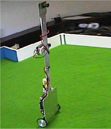 The goal keepers were a variation of the field player design. Since they needed to move primarily sideways instead of forward/backward, re mounted the goal keeper's top plate at a 90 degree angle to the bottom plate and equipped it with a larger ball kicking plate, as lined out in the RoboCup rules.