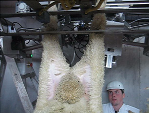 Y-Cut表示绵羊处理线前2切绵羊从链条上悬起双腿并切下前腿内部以中间相遇