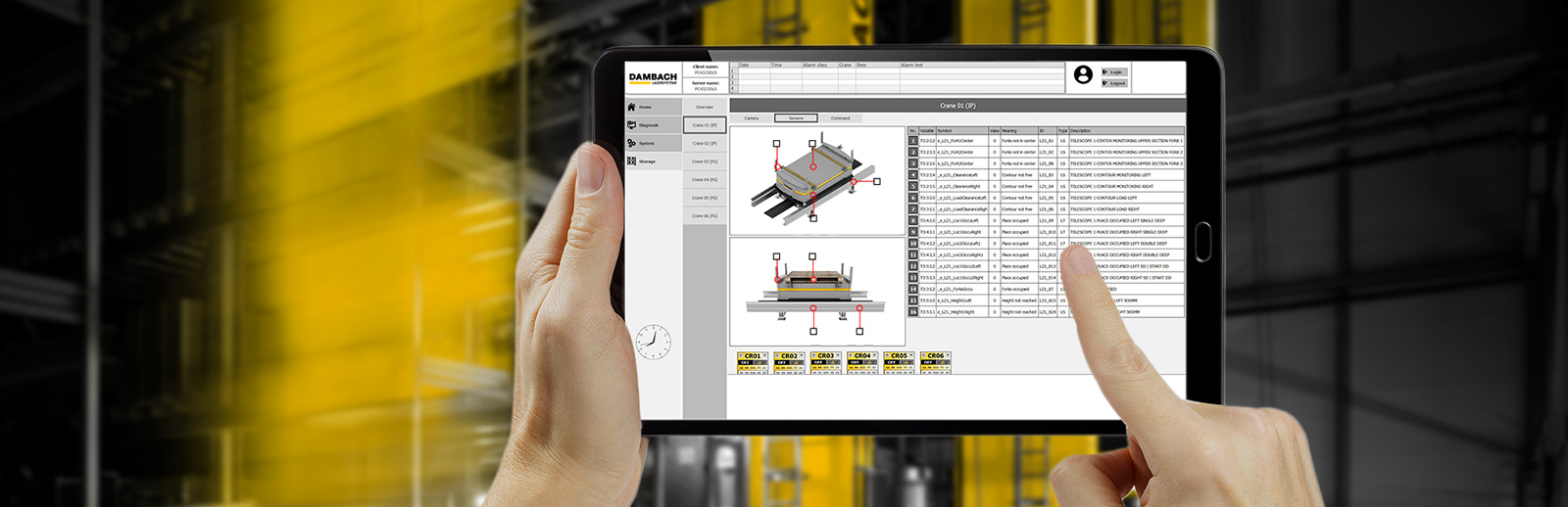 CARRIER和COMPCTSHUTLE之间有永久点对点无线电链路,以确保最大功能可靠性所有运动都由集成控制系统监控并相互比较DAMBACH控制保证通信安全最高,例如紧急情况下紧急停止信号安全复杂外部控件监控的缺陷取消深冻合适触摸显示器安排人工操作并确保易维护并调整载波