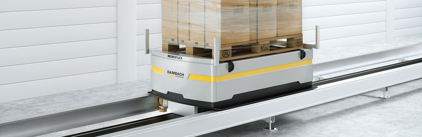 铁路引导车系统MONOFLEX用感应能提供电源智能轨迹引导车辆双轨运行MONOFLEX系统在吞吐量、弹性和可扩缩性方面制定新标准正确句号“动态仓储”,DAMBACHLagersystem提供高性能传送系统仓储或函数替代带连续传送器传送系统举例说MONOFLEX可组成多功能FLEX托盘系统理想补充