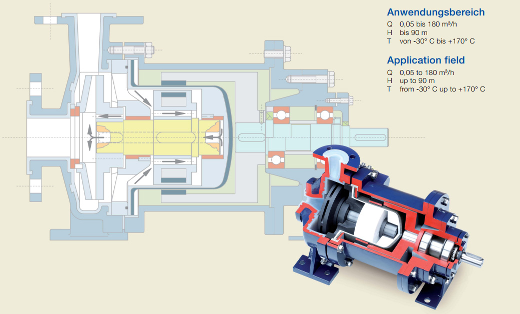 无打包单级外壳泵并带磁驱动器设计过程闭合路由PTFEhastwo轴承滑动轴承由碳化硅制成推力由推力承载定义侧流引导确保媒体完全免故障循环