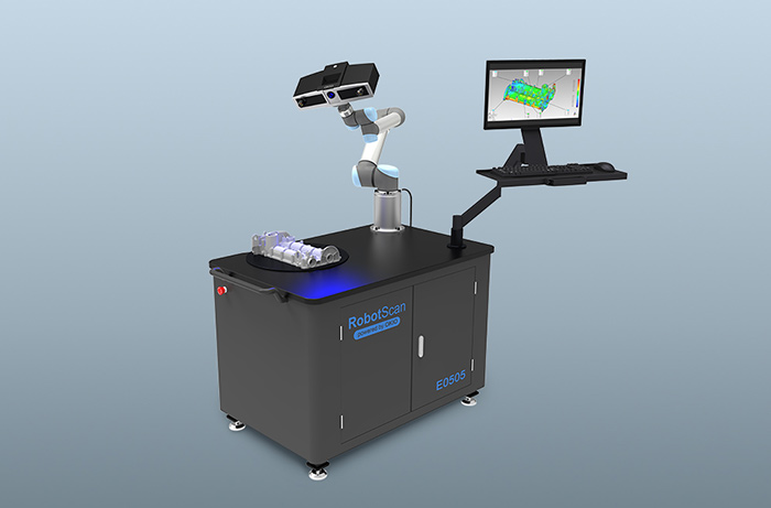 Shining3D智能机器人自动三维检验系统机器人SrobotScan整合蓝光高精度工业三维扫描技术与独有智能检验技术以通过单击完成整个扫描过程,从而大大提高检验效率